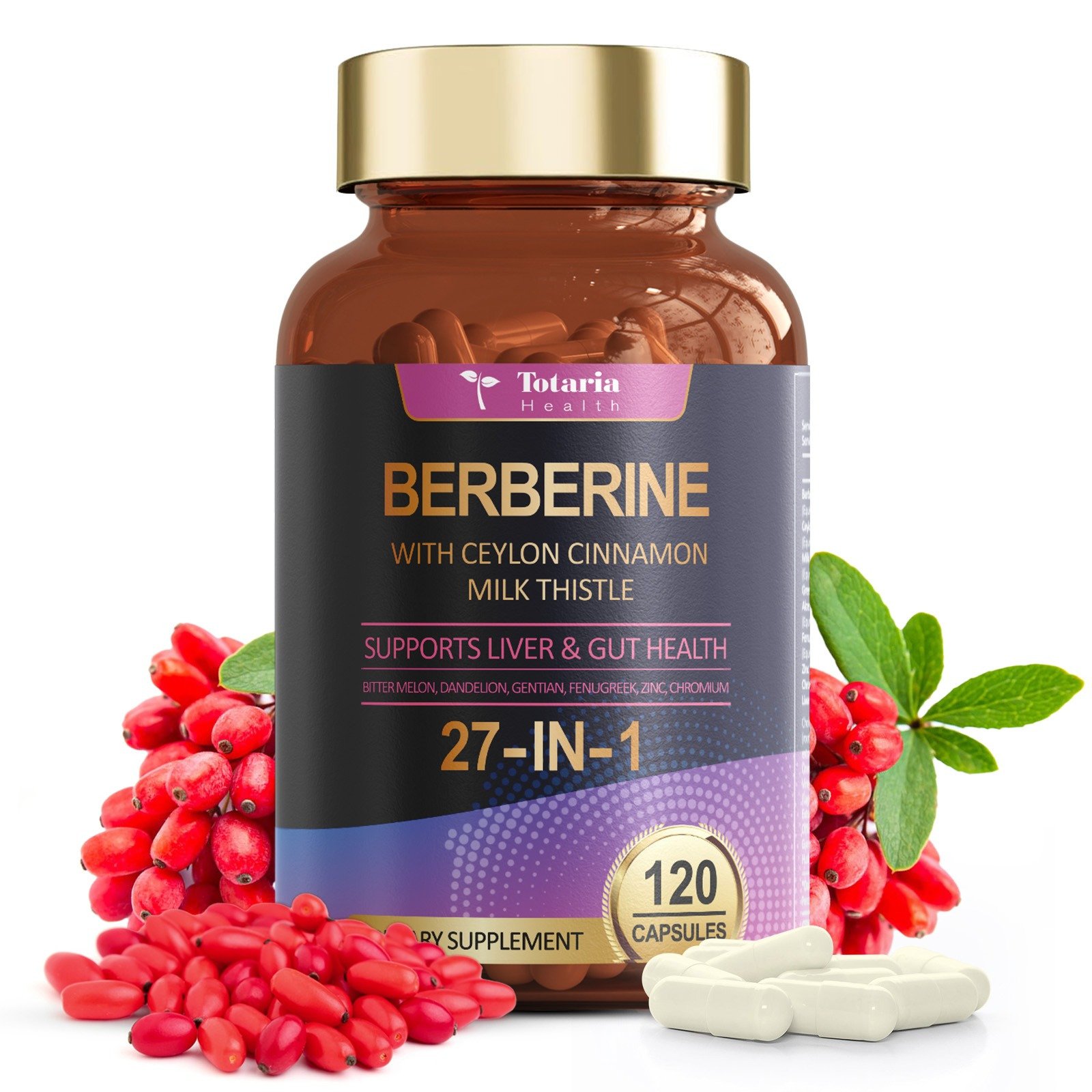 Experience the ultimate in health support with our potent blend of 27 supplements, all in one easy-to-swallow capsule. Designed for those who demand the best, Totaria Berberine Plus is your ally in promoting liver and gut health, boosting immunity, and enhancing digestive wellness.