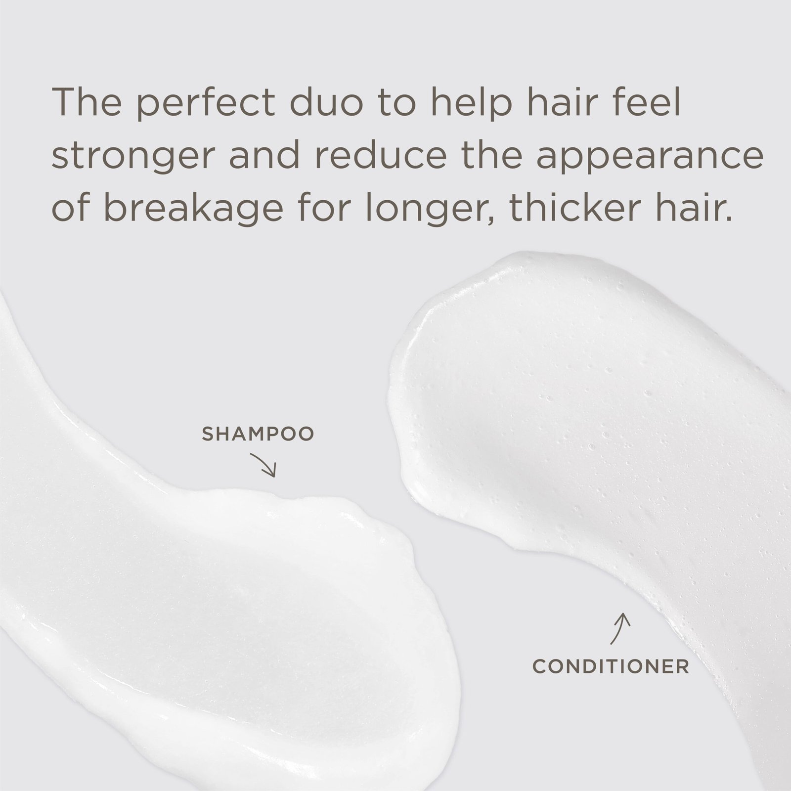 Our gentle shampoo fortifies each strand, reducing breakage and promoting a fuller appearance. The complementary conditioner enhances strength, visibly lengthens, and adds volume while ensuring your hair remains moisturized, supple, and easy to detangle.