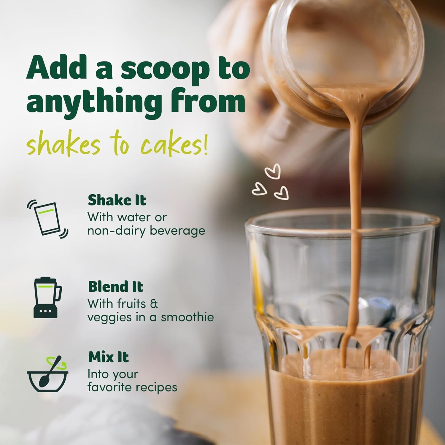 Mix a scoop into water or your favorite non-dairy drink for a silky-smooth texture. Perfect for enhancing your coffee, tea, or morning smoothie with extra nutrition.